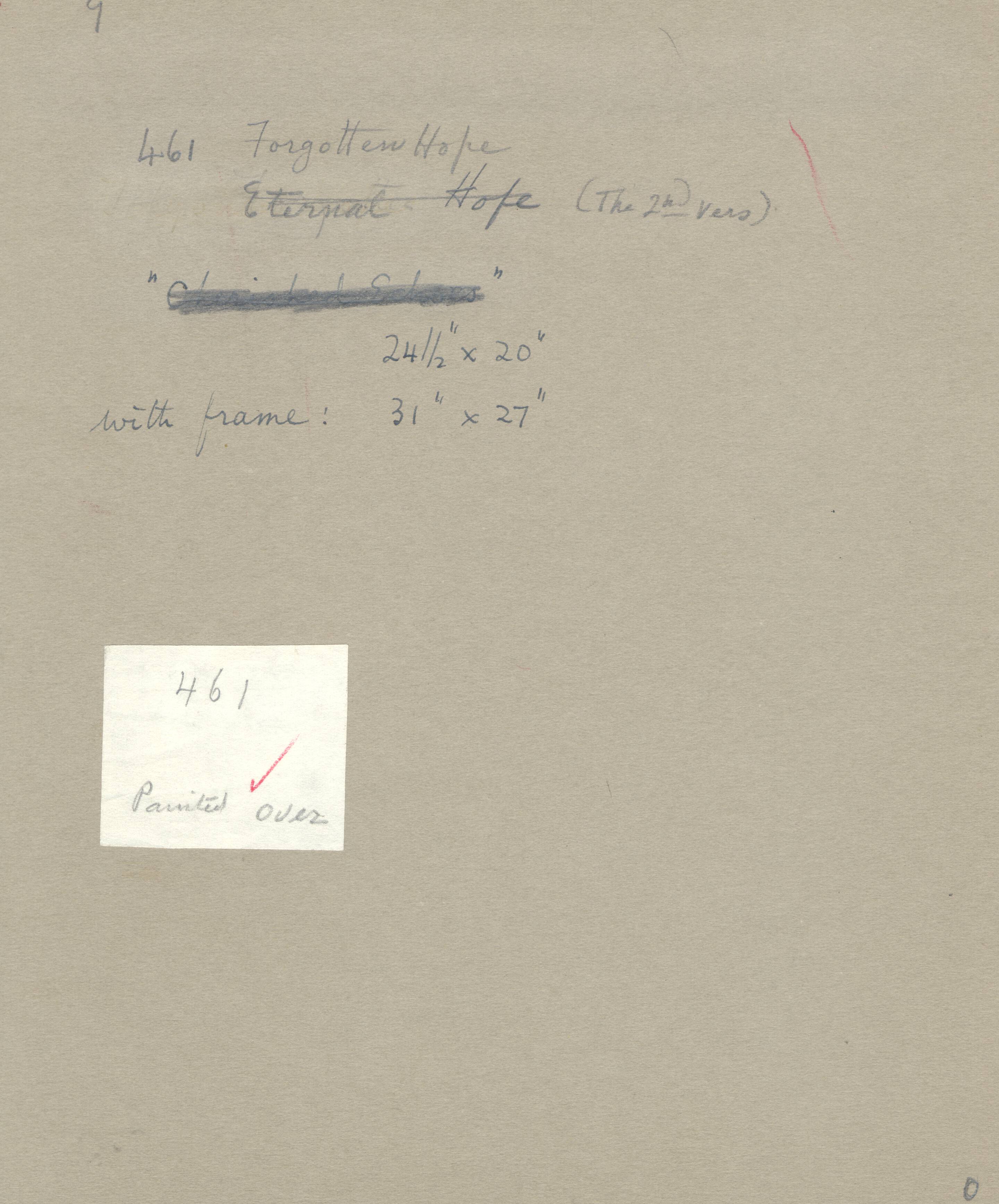Notes: "Forgotten Hope, #461," was painted by Hovsep Pushman, circa 1940. The original painting was later painted over. The second version of this piece was given the title, "Eternal Hope". It is housed in a Pushman original, hand selected frame and is listed in the Pushman inventory journal, #461.