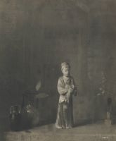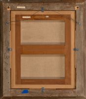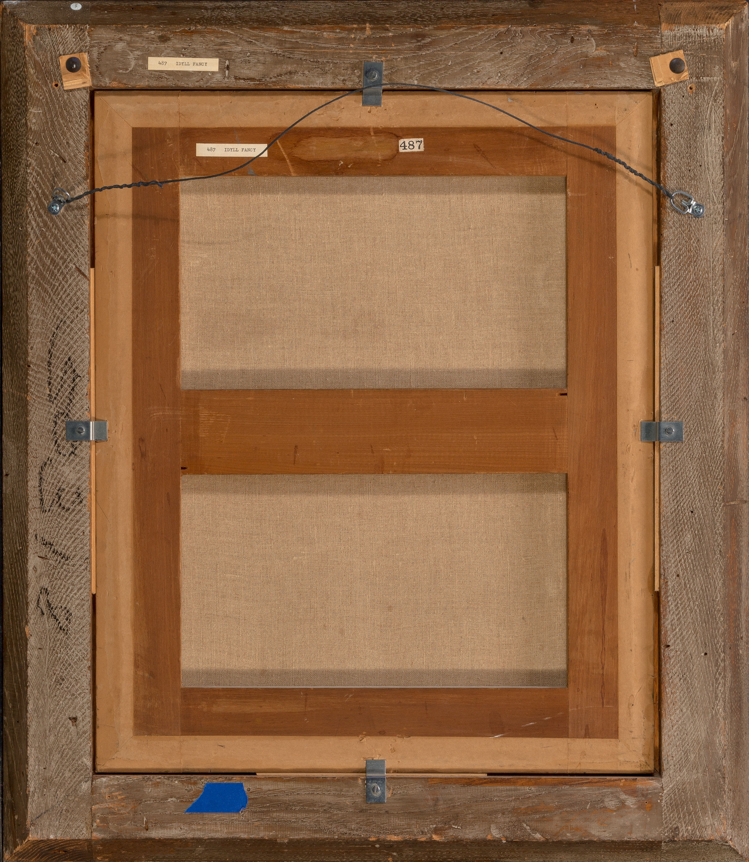 Notes: "Idyll Fancy, #487" by Hovsep Pushman, is signed lower right, Pushman, and was painted circa 1940. It is included in the Pushman journal, #487. The painting is painted on a specially designed panel over wooden stetchers. There appear to be 5-6 spots of inpaint along the top edge, the largest being approximately 1-inch in diameter. There appear to be two oval-shaped swaths of inpainting to the left and right of the figurine, each approximately 7 x 4 in., as well as a few possible minor spots of reinforcement in the vase--along the right side, base, and lip. Framed Dimensions 27.75 X 24 Inches