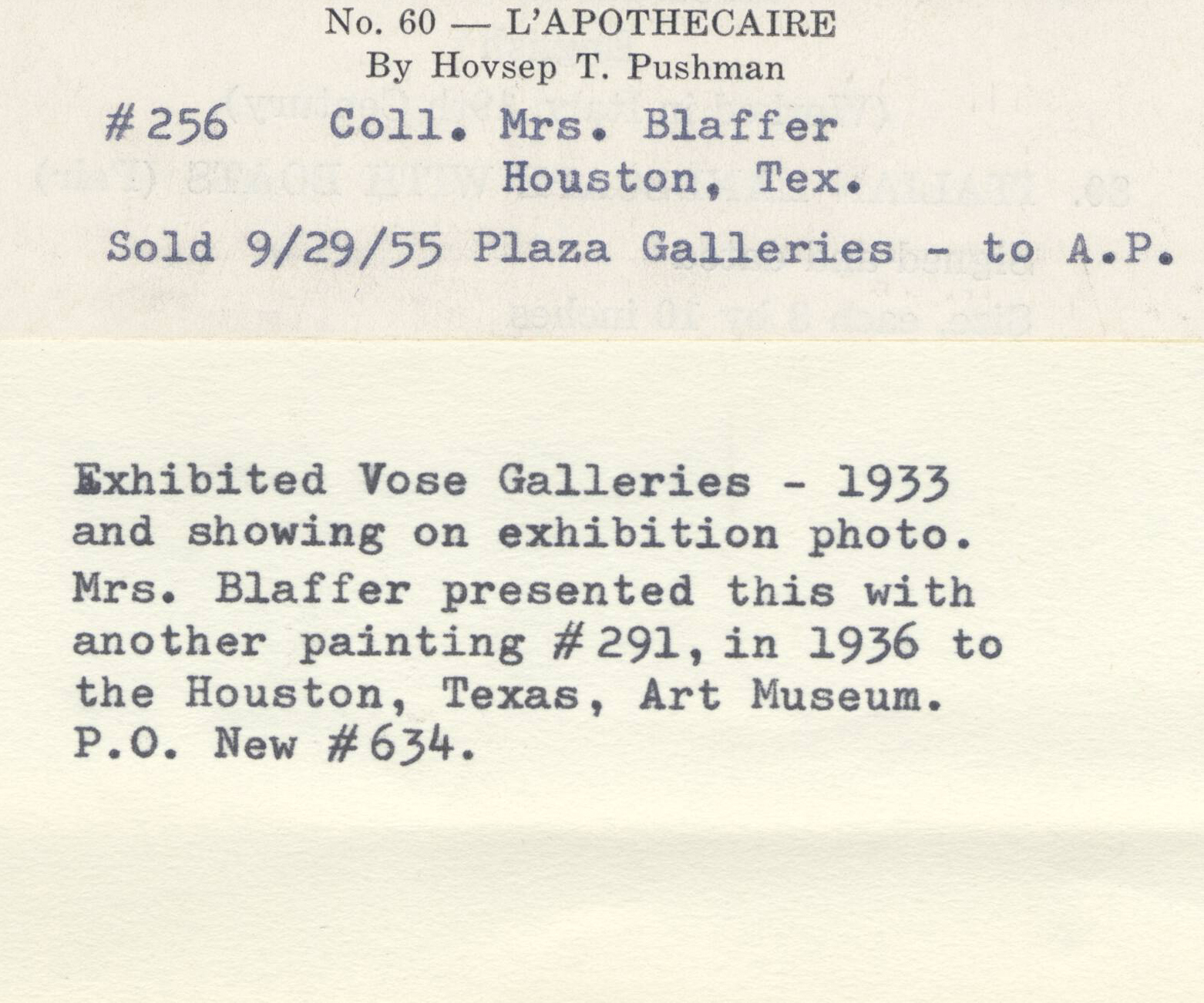 Notes: "L'Apothecaire, #256," was painted by Hovsep Pushman, circa 1920-1930. The painting is signed, lower right, and is listed in the Pushman inventory journal, #256. This painting was exhibited at Vose Galleries, 1933, and showing on the exhibition photo, Mrs. Blaffer presented this with another painting #291, in 1936 to the Houston, Texas, Art Museum P.O. New #634.