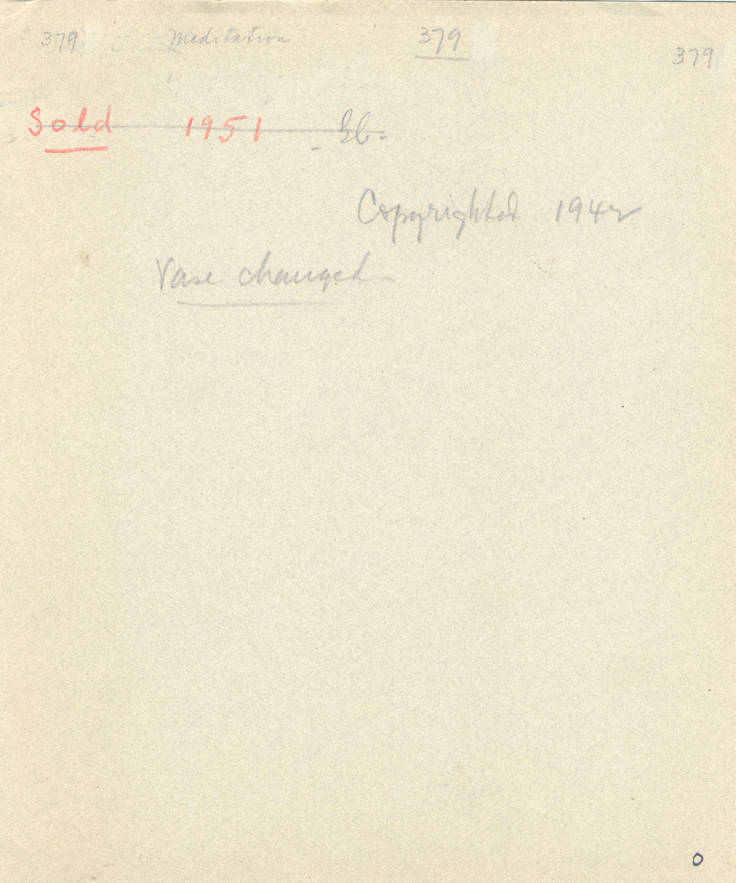 Notes: "Meditation, #379," was painted by Hovsep Pushman, circa 1940. The original painting was painted over. It is signed, lower left, and was copy righted in 1942. The painting is listed in the Pushman inventory journal, #379. Published in 1949 by Frost & Reed England and Robert Lesch New York, publishers info along the top edge.