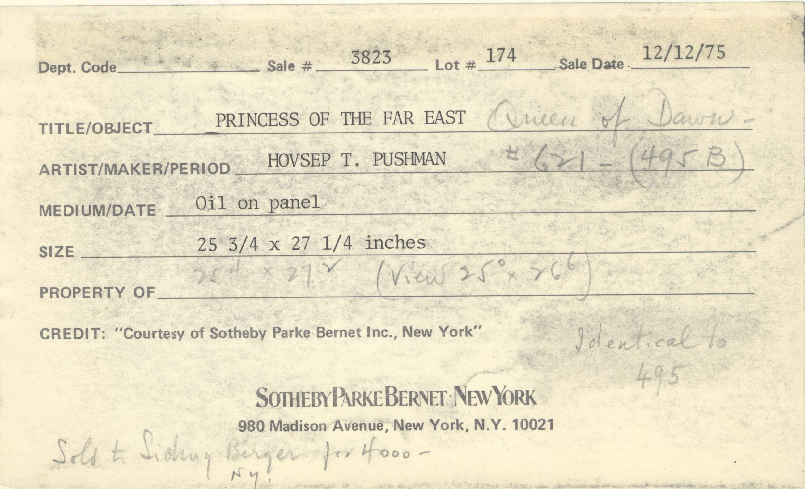 Provenance: Pushman Studio, NY; Grand Central Gallery, NY; Sotheby Parke Bernet Inc, NY; Sold: Sidney Berger; Private collection