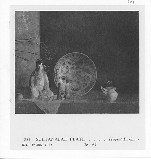 Notes: "Sultanbad Plate, #281", was painted by Hovsep Pushman in 1942. The painting is in the Pushman inventory journal, #281, and is housed in an original, Pushman frame. It is signed, lower left; titled on gallery label verso.