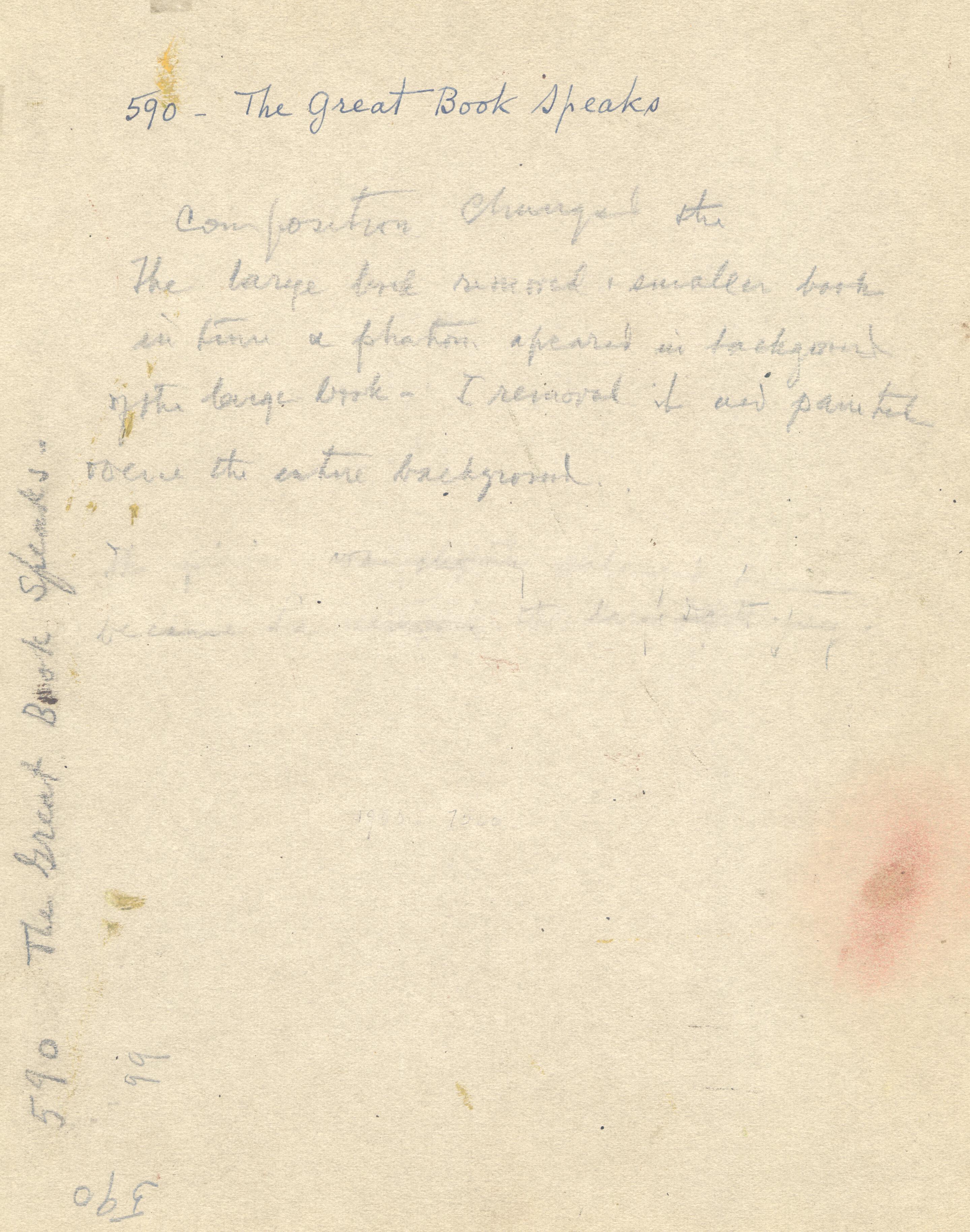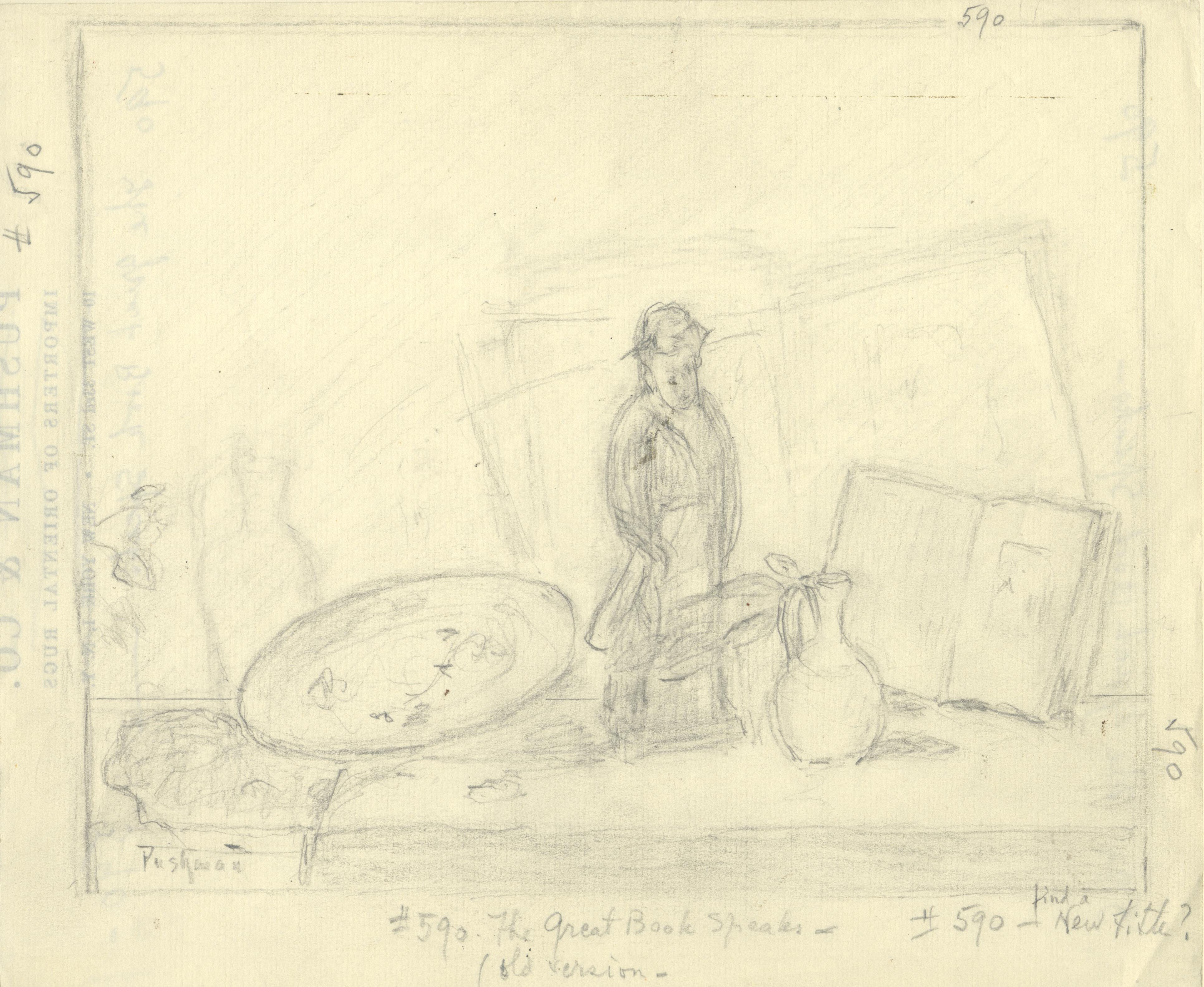 Notes: "The Great Book Speaks", was painted by Hovsep Pushman, circa 1950. It was later painted over, and changes to the composition were made. The painting is signed, lower left, and is listed in the Pushman inventory journal, #590.