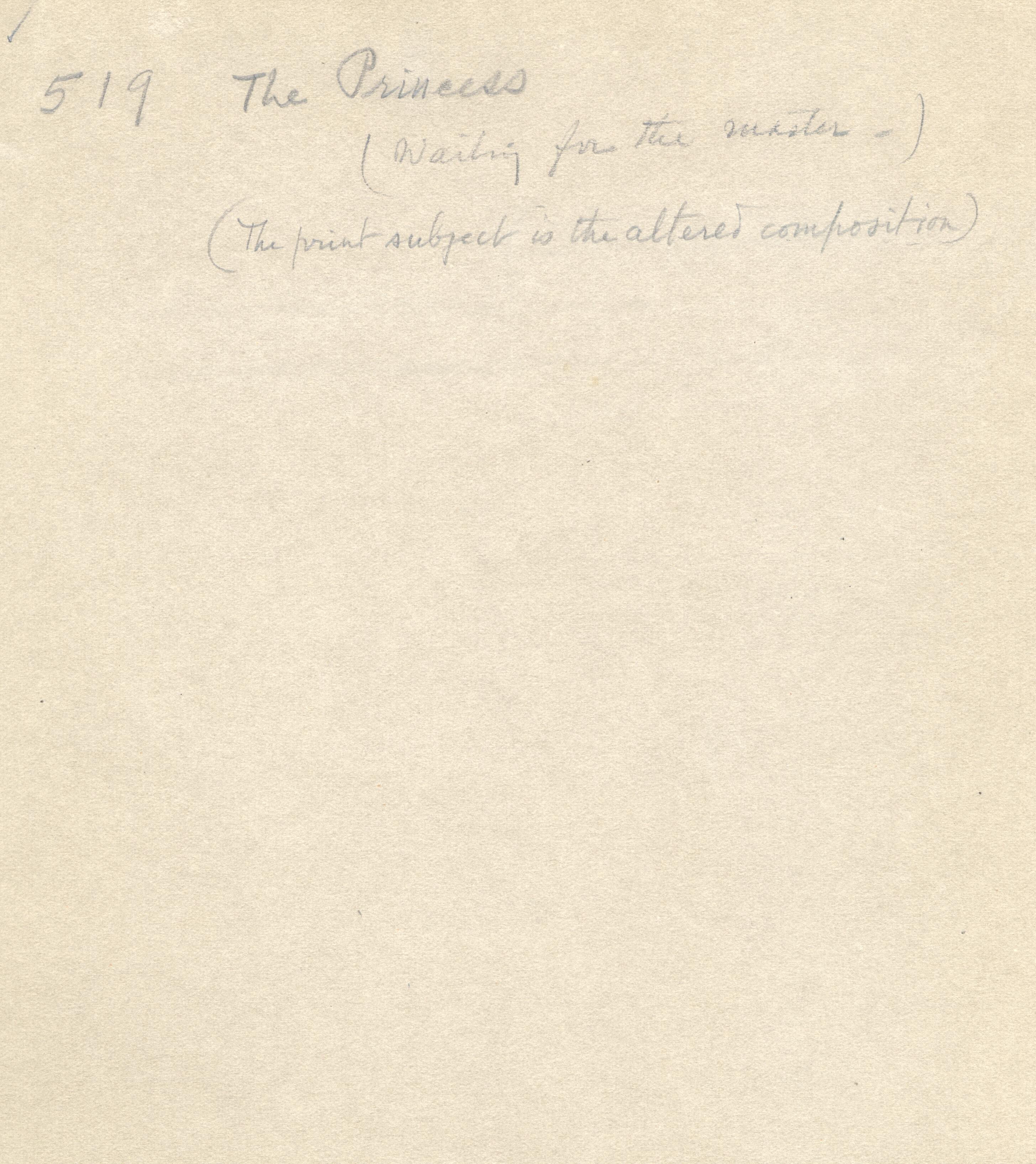 Notes: "The Princess, #519", formerly titled, "Waiting for The Master", was painted by Hovsep Pushman, circa 1940. The print subject is the altered composition. The painting is signed, lower right, and is listed in the Pushman inventory journal, #519.